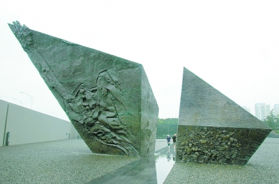 建筑師為紀(jì)念館設(shè)計(jì)的主建筑由東至西,最高處18米,最低處西端為正負(fù)零。我設(shè)計(jì)的《冤魂吶喊》在西端,從構(gòu)思上步入情緒高潮,從整體視覺形式上呼應(yīng)了建筑,也為建筑的西端增加了應(yīng)有的平衡。它以劈開的山形寓意破碎的祖國河山,其豁口便自然成了紀(jì)念館的門道。它虛擬城門,是逃難之門,是死亡之門。左側(cè)三角形直指蒼穹,塑造了一吶喊的冤魂。右側(cè)表現(xiàn)的是平民生靈被屠戮的場面。它拔地而起,斜插云霄;是冤屈的吼聲,是正義的呼號。以三角形的視覺沖擊,緊連大地?cái)z人魂魄,撼人心魂。