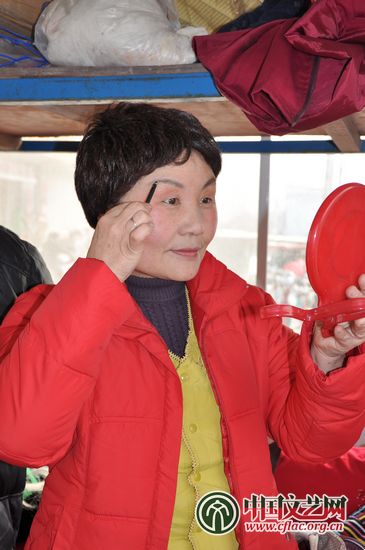 為了能讓村民們能按時看上演出,票友們從早上8點多就開始著手準備。記者在現場看到,在舞臺的旁邊,一個滿頭白發的老人已經畫好了妝,正對著鏡子仔仔細細地包頭。他叫殷召云,今年82歲了,是票友協會的藝術指導,已經唱了幾十年的戲了,票友們排練劇目都找他點撥。今天的演出,殷老第一個上臺,因為擔心老人的身體,他的兒子在一旁全程陪同。穿好戲服后,老人又對子鏡子前前后后的整理,神態嚴肅,一絲不茍。伴隨著打擊樂和京胡聲的響起,八十多歲仍然鏗鏘有力的“麒派”唱腔與做功,贏得了滿堂喝彩。
