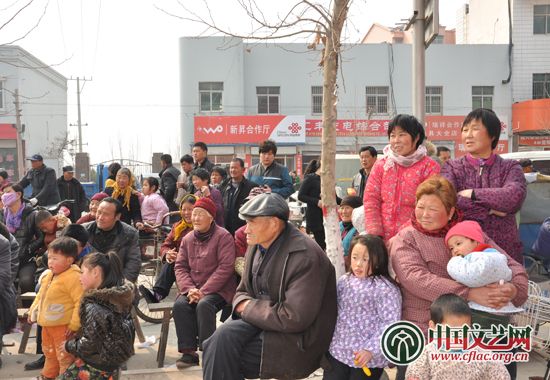 村民們非常喜歡看戲,早春的天氣還有些冷,但不到8點,鎮駐地周圍的村民們就扶老攜幼,陸續趕到鎮駐地蘇果超市門口臨時搭起的舞臺前。很多年輕人幫父母提拿小凳子趕來,希望占個中間位置。來得晚的,就只能站在后面看了。戲臺前和左右兩邊都圍滿了聽眾,遠處還有人在不斷趕來。村民老劉說, 他是陪著爹娘和閨女、媳婦一家五口來看戲的。能在自己家門口看到這樣的京劇大戲,他覺得很高興:“我已經看了15年咱周營鎮京劇票友協會的演出了,每次票友藝術節我都來,雷打不動。他們戲唱得很好,俺村的人都喜歡看。”