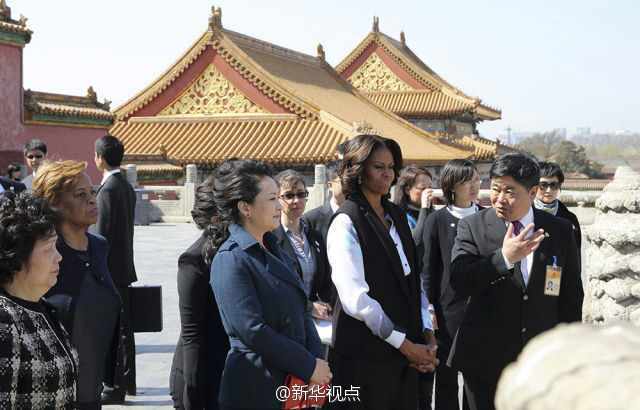 北京3月21日電 據新華社“新華視點”微博報道,21日,彭麗媛和米歇爾一起參觀故宮。故宮博物院院長單霽翔介紹說,故宮在北京的中軸線上。在美國華盛頓,國會山到林肯紀念堂也在一條中軸線上,這說明中美在建筑和城市規劃上也有相通之處。