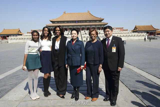 仲春時節的北京,陽光明媚,春意盎然,故宮的紅墻黃瓦在湛藍的天空下格外明艷。在太和殿前,彭麗媛同米歇爾及家人合影。
