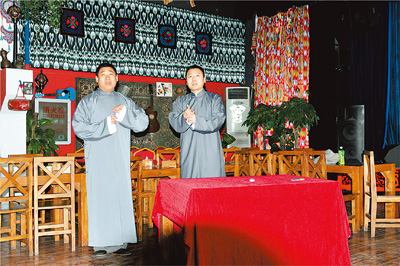 馬春然(右)與搭檔王繼濤在演出相聲《四大名旦》。