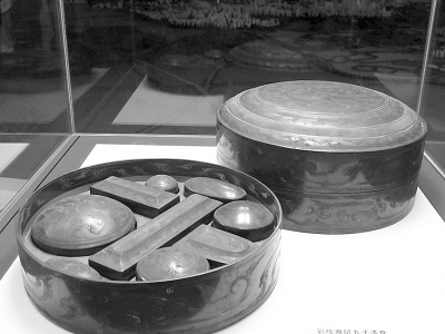 彩繪雙層九子漆奩(lian,古代婦女梳妝用的鏡匣)