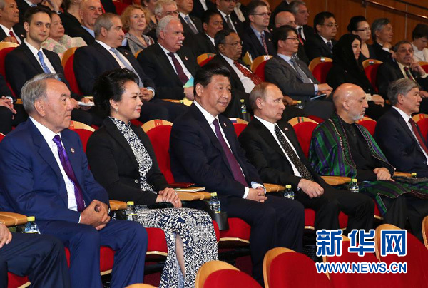 歡迎宴會后,“團結和諧的亞洲-攜手向明天”-亞洲相互協作與信任措施會議第四次峰會文藝晚會在上海大劇院舉行。