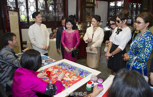 上午,柬埔寨首相夫人文拉妮、吉爾吉斯斯坦總統夫人阿坦巴耶娃、阿塞拜疆總統夫人阿利耶娃、哈薩克斯坦總統女兒納扎爾巴耶娃抵達豫園,受到彭麗媛熱情歡迎。