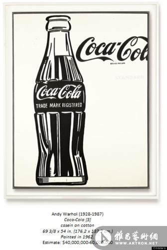 安迪·沃霍爾手繪的這幅高約6英尺的“可口可樂(3)”創(chuàng)作于1962年,與其后期創(chuàng)作的絲網版畫風格不同。佳士得戰(zhàn)后及當代藝術部國際區(qū)總裁Brett Gorvy表示:“如果你想要定義波普藝術,看這幅畫就夠了,因為它含有兩個最具代表性的元素:可口可樂和安迪·沃霍爾。”