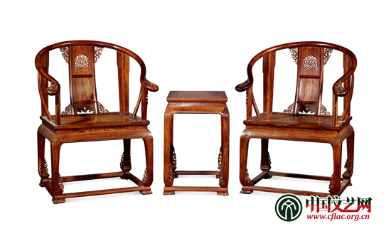 注解:這種圈椅源自清中期宮廷“紫檀工”經典樣式,故如今家具行習稱宮廷圈椅,而兩椅中間置一幾的陳設方式則從清中晚期品茗待客的官場習慣演變、沿襲來的。此堂四椅兩幾今為古典式客廳主座兩側標準配置。此圈椅做工精致,椅圈渾圓,五接式;靠背板兩抹三拼板,上下絳環板及牙板帶鏤雕。椅盤為攢框鑲板,高束腰,彭牙鼓腿,內翻馬蹄,下承托泥。托泥下四角出龜足。茶幾與椅盤做法完全相同,同樣為攢框鑲板,高束腰,彭牙鼓腿,內翻馬蹄,下承托泥,托泥下出龜足。