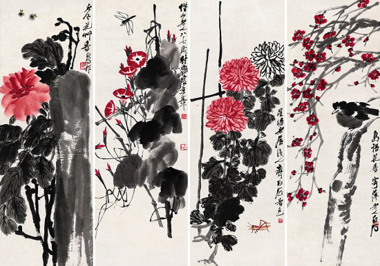 他獨創(chuàng)的“紅花墨葉”亮色花卉,再加上白色的宣紙,三種顏色形成強(qiáng)烈對比,這種高純度的色相和補(bǔ)色對比,體現(xiàn)出了大眾化的色彩傾向,造成了濃烈而鮮亮的視覺效果。某種程度上說,這種大眾化、民間化的色調(diào)原則也構(gòu)成了當(dāng)代繪畫的色彩基礎(chǔ)。