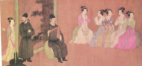 “絲竹樂”盛行于中古時(shí)期。經(jīng)歷了漢代“相和大曲”(常用樂器有節(jié)、笙、笛、琴、瑟、琵琶、箏7種,其中琵琶即阮,均為漢族樂器)、魏晉時(shí)期的“清商大曲”(常用樂器有鐘、磬、琴、瑟、擊琴、琵琶、箜篌、筑、箏、節(jié)鼓、笙、笛、簫、篪、塤等15種,依然為漢族樂器,享有“華夏正聲”美名)和唐代“燕樂大曲”(包括“龜茲樂”、“西涼樂”、“清商樂”3種不同風(fēng)格音樂及其樂器組合)三個(gè)階段。中國(guó)器樂形式由單一漢族樂器衍變?yōu)楹臀饔驑菲鳡?zhēng)奇斗艷、各顯神通的時(shí)代。樂器是音樂演奏的器具,器樂是樂器演奏的音樂,兩者互為表里。從漢代“相和歌”的“絲竹更相和,執(zhí)節(jié)者歌”到唐玄宗在梨園的“絲竹之戲,音響齊發(fā)”,中古時(shí)期的“絲竹樂”色彩繽紛,魅力無窮,各懷絕技,引人入勝。