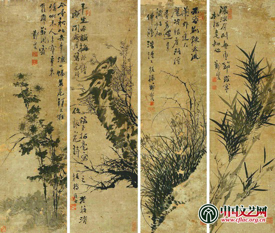 “清初四高僧”指弘仁、髡殘、朱耷、原濟四人的合稱。他們于明亡后,皆出家為僧,均深通禪學,寄情書畫,屬南宗畫派、文人畫派大系,各有獨特的風格造詣。