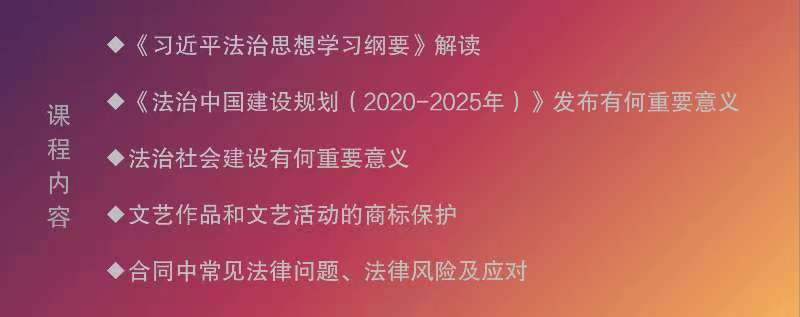 培訓(xùn)班注重加強(qiáng)對(duì)文聯(lián)干部和文藝工作者的思想政治理論培訓(xùn),緊密結(jié)合文藝維權(quán)工作實(shí)際需要和文藝工作者的維權(quán)需求,科學(xué)設(shè)置相關(guān)課程。培訓(xùn)課程詳細(xì)介紹了《習(xí)近平法治思想學(xué)習(xí)綱要》的主要內(nèi)容,闡釋了習(xí)近平法治思想的重大意義、豐富內(nèi)涵、核心要義、精神實(shí)質(zhì)、實(shí)踐要求。培訓(xùn)課程解讀了《法治中國(guó)建設(shè)規(guī)劃(2020—2025年)》和《法治社會(huì)建設(shè)實(shí)施綱要(2020—2025年)》對(duì)新時(shí)代更好發(fā)揮法治固根本、穩(wěn)預(yù)期、利長(zhǎng)遠(yuǎn)的重要作用。培訓(xùn)課程以文藝作品和文藝活動(dòng)的商標(biāo)保護(hù)為重點(diǎn),通過(guò)典型案例講解了商標(biāo)保護(hù)對(duì)文聯(lián)組織、文藝單位和文藝工作者的積極作用,提示風(fēng)險(xiǎn)提出建議。培訓(xùn)課程結(jié)合演出活動(dòng)、文藝創(chuàng)作與作品傳播等文聯(lián)組織和文藝工作者常用合同類型,以案說(shuō)法,分析了合同糾紛中常見(jiàn)的法律問(wèn)題,并提供具體應(yīng)對(duì)方法。
