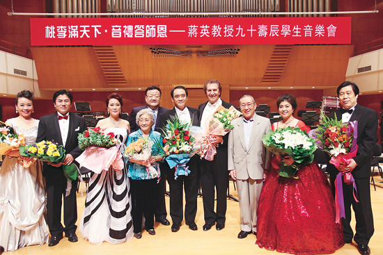 2009年9月4日,由中國音協與鳳凰衛視主辦的“桃李滿天下·音禮答師恩——蔣英教授九十壽辰學生音樂會”在北京音樂廳舉行。蔣英的得意門生:章亞倫、祝愛蘭、姜詠、趙登營、多吉次仁及吳曉路從世界各地趕回北京登臺。圖為蔣英、嘉賓與學生們在一起