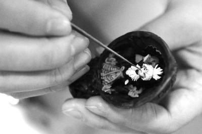 2012年12月21日,濟南市第二屆非物質文化遺產手工藝技能大賽開賽,125名來自山東、河南、江蘇等地的非物質文化遺產手工藝人各顯身手,圖為一名手工藝人在核桃殼里制作面塑作品。郭緒雷 攝