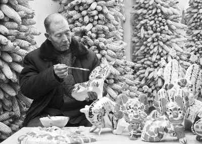 和胡永興相比,胡深另一位徒弟、侄子胡新明則能闖敢干,在鳳翔泥塑的產(chǎn)業(yè)化開發(fā)上下了許多功夫,早早地就走在了胡深和胡永興的前面。前些年,胡新明自籌資金申請(qǐng)注冊(cè)了“胡新明泥塑”商標(biāo),并建立了自己的網(wǎng)站,成立了新明民俗文化傳播公司。論鳳翔泥塑的銷售收入,胡新明比胡深父子要可觀。當(dāng)然,胡新明在鳳翔泥塑的生產(chǎn)技術(shù)革新方面也有自己的貢獻(xiàn)。1988年前,六營(yíng)村的泥塑也曾多次出口,但當(dāng)泥塑產(chǎn)品運(yùn)到西安時(shí),已有20%的破損率,運(yùn)到國(guó)外后甚至是100%破損,因此沒了回頭客。鑒于此,善于鉆研的胡新明開始對(duì)鳳翔泥塑進(jìn)行技術(shù)革新,經(jīng)過多次實(shí)驗(yàn)后,他在泥中加入糯米,將先前制作原料之一的麻紙換成了棉花,不但降低了成本,也成就了鳳翔泥塑“摔不爛”的美名。“摔不爛”泥塑研制成功后,鳳翔泥塑的銷售有了很大起色。