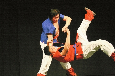 2009年傅文剛(身著藍(lán)衣)在德國(guó)表演中國(guó)式摔跤