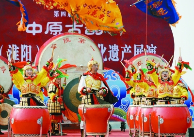 3月13日,第四屆中原古韻中國(淮陽)非物質文化遺產展演活動在河南省淮陽縣開幕。來自河南、山東、山西、安徽、河北、湖北、江蘇、江西、陜西、湖南十省的國家級非物質文化遺產項目競相登場亮相,為當地群眾和游客奉獻了一道民俗文化盛宴。圖為江蘇省留左大鼓表演團在現場表演《普天樂》。 新華社記者 李 博 攝