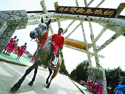 節日期間,一位鄂倫春族青年身著民族服裝騎馬經過黑龍江省黑河市新生鄂倫春民族鄉的大門。