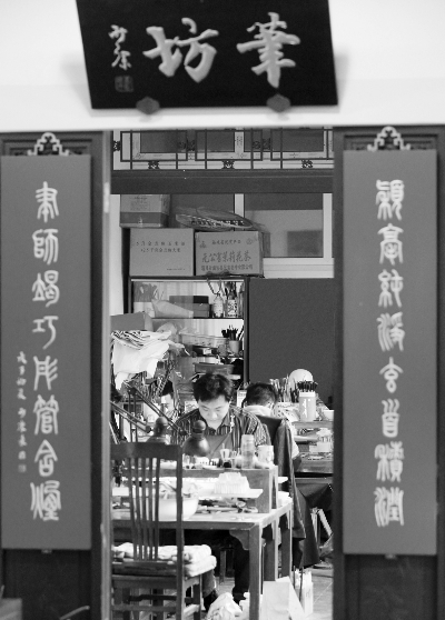 與琺瑯廠“廠中設(shè)店”有異曲同工之妙,2007年,京城老字號戴月軒恢復(fù)了“前店后廠”經(jīng)營模式。走進(jìn)戴月軒,古樸典雅的店鋪柜臺后面連著一個(gè)“筆坊”,人們可以靜觀“筆坊”內(nèi)制筆師傅們“千萬毛中撿一毫”的制筆技藝,親眼領(lǐng)略一支毛筆從選材到制成所經(jīng)過的上百道工序。于天鶯說,之所以把毛筆的整個(gè)流程都搬到店里,并且建成開放式的,就是想讓顧客看到整個(gè)工藝制作流程,知道好的毛筆是怎樣做出來的,并感受筆工做筆那份“毫雖輕,功甚重”的辛苦。