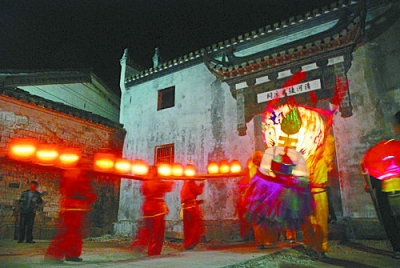 “接龍”儀式通常在祠堂前的鄉場上舉行。每家每戶派出一名代表盛裝打扮扛著自家的龍段,按輩分大小依次排成長隊。族長下令“接龍”,首先接龍頭,依次接龍身,每接一段龍身,舞龍者都要高喊一聲“接龍啰”,最后接上龍尾。接著,族長下令“點燭”,頓時鼓樂齊鳴,龍身上的紅燈籠依次點亮,進而進入“游龍”階段,舞龍隊伍沿著村路蜿蜒經過村里的每家每戶。徽州板凳龍的長度由各村戶數的多少而定,一般八九十戶的村莊連接成的板凳龍通常有100多米長,這也使得游龍的場面十分壯觀。