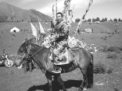 巴塔第一次公開(kāi)表演《江格爾》是在上世紀(jì)90年代,在他等待了20余年之后,當(dāng)時(shí)鄉(xiāng)里的舞臺(tái)下雖然只坐著七八位觀眾,但他有種抑制不住的激動(dòng)和興奮。緊接著的賽馬會(huì)上,面對(duì)上千名觀眾,他依舊不怯場(chǎng),讓大家跟隨他一起去感受《江格爾》英雄史詩(shī)的雄壯和魅力。從那開(kāi)始,巴塔在親友聚會(huì)、婚喪嫁娶、節(jié)慶典禮等場(chǎng)合都會(huì)充滿激情地說(shuō)唱《江格爾》,并樂(lè)此不疲。