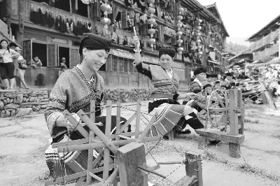 近日,居住在廣西龍勝各族自治縣和平鄉(xiāng)金坑瑤寨的瑤族同胞們迎來(lái)了傳統(tǒng)節(jié)日“曬衣節(jié)”。每逢農(nóng)歷六月初六,當(dāng)?shù)丶t瑤(瑤族支系)婦女都會(huì)在屋外掛出鮮艷的民族服裝晾曬,企盼去除晦氣。同時(shí),當(dāng)?shù)丶t瑤群眾還會(huì)穿上節(jié)日盛裝,為來(lái)自各地的游客表演紅瑤迎親、瑤族姑娘繡女紅等極具傳統(tǒng)民族特色的節(jié)目。圖為紅瑤婦女在展示傳統(tǒng)編織工藝步驟。