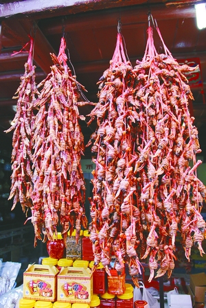 高淳老街是一個讓人放慢腳步的地方,安安靜靜,它是江蘇省保存最完整的的明清古街。老街能留住人的腿,也能留住人的胃,老街上有不少美食,比如說鴨腳包。這是我第一次見到這種東西,成串成串地捆起來吊在房檐下,漬紅的顏色分外誘人。聽當(dāng)?shù)厝苏f,將經(jīng)過特殊腌制的鴨掌里放一塊鴨心,然后用鴨腸綁起來,就是鴨腳包了。吃時放在籠屜里蒸熟,筋道而令人口舌生津,煲湯時放兩個鴨腳包進(jìn)去,也是別樣的美味。老街的臭豆腐有白豆腐和黑豆腐兩種,滾熱的油里一炸,澆上點佐料就可以開吃了。與臭豆腐同賣的還有小螃蟹、小魚、藕夾之類的,這就是別處豆腐攤難見的了。因老街緊鄰固城湖,固城湖的螃蟹是當(dāng)?shù)氐男∮忻麣獾奶禺a(chǎn)。油炸的小螃蟹裹一層面,巴掌大小,沒了霸氣橫行的姿態(tài),看起來有一些萌,反倒讓人不忍心下口了。