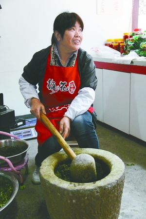 街邊一屜雪白的米糕剛剛出籠,每兩塊扣在一起,方方正正,上印花紋,像舊時人家小姐的袖珍首飾盒子。女主人正在搗著什么,石臼、石錘,綠汁飛濺,旁邊一大盆綠色頂著小黃花的野菜。我過去問,女主人和氣地說,搗的香草,是做米糕的原料之一,說著又拿米糕給我們嘗。米糕很松軟,細(xì)膩溫潤,有淡淡的米香和草香。一路上有各色的點心、各色的腌菜、各色的山野菜、湖魚水產(chǎn)。各個攤位上的魚頭是亮點,胖魚頭傻傻呆呆的樣子,嘴巴里卻塞了只紅彤彤的新鮮大辣椒,像是扮鬼臉吐大舌頭,愈加顯得呆傻。
