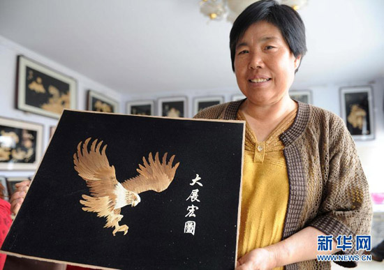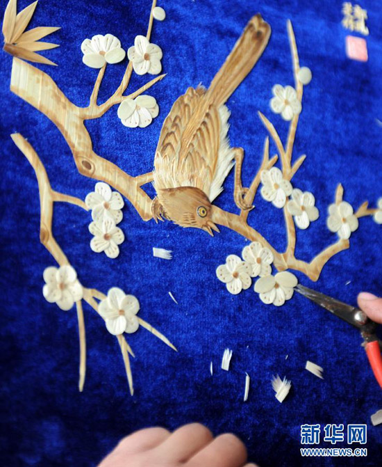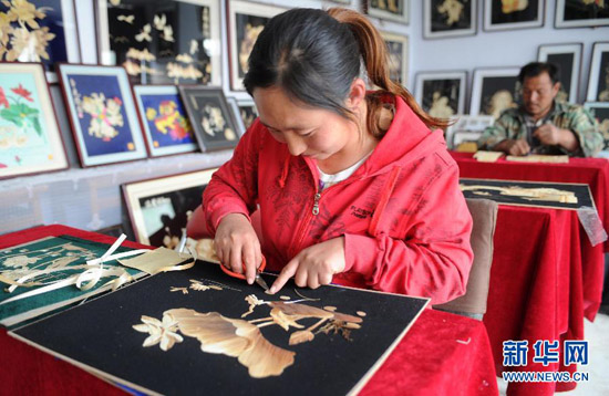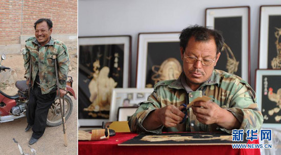 58歲的郭鳳芝是河北豐寧滿族自治縣的一位下崗工人,19年前因患病致四級聽力殘疾。2001年,有美術功底的她開始嘗試用野草、高粱、玉米等植物秸稈制作秸稈畫。歷經3年鉆研,她將秸稈畫的主要材料定位于玉米秸稈。經過清洗、漂白、消毒、劈剝、熏蒸、粘貼等工序,采用裁剪、雕刻、薰燙等多種技法,不起眼的玉米秸稈變成了精美的秸稈畫。如今,郭鳳芝的秸稈畫已經遠銷新加坡、韓國等地,她還帶出了30多位徒弟,他們大多都是殘疾人、下崗失業人員和享受最低生活保障人員,每名弟子的月收入都超過1500元。郭鳳芝說:“身殘志堅,一樣能致富。我的夢想是讓殘疾人和生活困難的朋友掌握一技之長來改善自己的生活。” 新華社發(王曉攝)