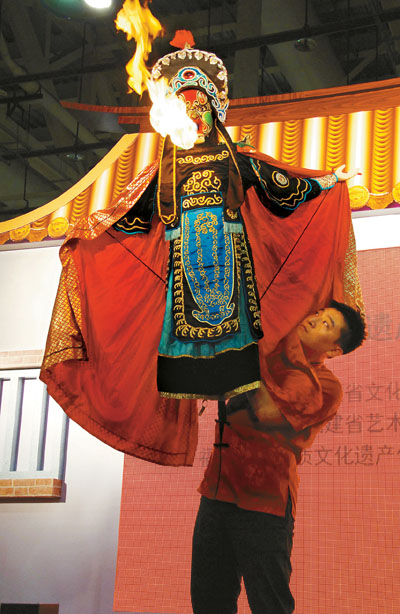 在剛剛落幕的第五屆海峽兩岸(廈門)文博會上,來自福建漳州木偶劇團的梁師傅,為廈門的觀眾表演木偶川劇變臉和噴火。