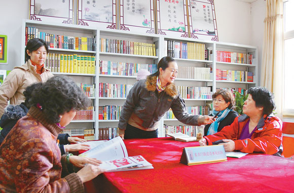 11月11日,十八大新聞中心組織30多家中外媒體記者前往北京市東城區東直門街道參觀采訪。記者們深入清水苑社區參觀了社區活動中心、圖書館、網格工作站,感受了社區文化建設給居民生活帶來的巨大變化,后又前往位于安定門內的創意文化民俗風情胡同——五道營胡同,了解五道營的總體面貌和特點,并就如何打造創意產業進行了深入采訪。圖為記者在清水苑社區圖書館采訪閱讀圖書的居民。