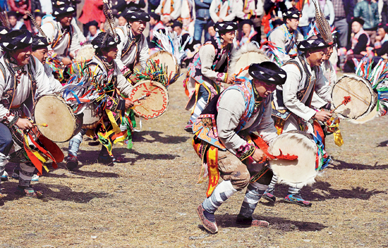 3月13日是農歷二月初二,羌族傳統的祭祀神靈、祈禱風調雨順的日子,即“夬儒節”。四川阿壩藏族羌族自治州理縣蒲溪鄉5個村的群眾,以原生態的歌舞展現古羌族人民生產生活和祭祀場景,共同慶祝傳統節日。圖為蒲溪鄉群眾表演《爾瑪圣鼓》。