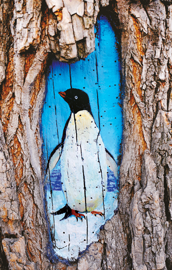 近日,走紅于網絡的“樹洞女孩”王月帶著11位熱心環保公益事業的“扮美志愿者”在大連市西崗區正仁街兩旁的樹上進行創作。據悉,王月寒假過后就帶領同學們在學校附近的居民區中墻壁上進行創作。她夢想能帶領更多的繪畫者,畫遍大連的街區、角落,希望有更多的“扮美志愿者”加入到“扮美大連”的隊伍中。圖為王月公益團隊里的一位繪畫者在一棵大樹的樹洞上繪畫的企鵝。