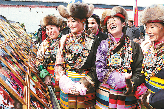 西藏文聯、西藏攝影家協會聯合日喀則地委組織部和第六批山東援藏干部管理中心,近日在日喀則地區白朗縣吉定村舉辦攝影展,慶祝西藏百萬農奴解放54周年,受到當地村民熱烈歡迎。此次展覽展出120余幅圖片,是西藏攝協從攝影家、山東援藏干部楊國瑩兩年多深入吉定村跟蹤拍攝的數千幅照片中精選出來的,從一個側面反映了西藏全區加強基層黨組織建設、民族團結、和諧穩定、發展經濟、建設社會主義新農村等方面的新發展新變化。活動期間,主辦方還向村委會贈送了畫冊年歷和體育用品。圖為村民們看到展覽照片后樂不可支。 文/何見遠 圖/車 剛