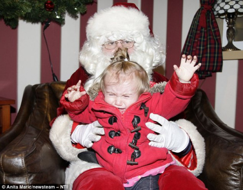 據外電11日報道,一趟能看到圣誕老人的旅行應該是孩子們在圣誕節里最大的樂趣之一了。但是,當真正面對著一個巨大的、不熟悉的身影(有時還黏貼著可疑的塑料胡須)時,這些小孩了們顯然還是受到了驚嚇,甚至試圖逃跑。