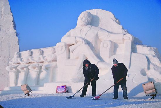 12月24日,牡丹江雪堡靚裝迎客,以“歡樂王國·夢幻俄羅斯”為主題的系列雪雕作品吸引了眾多游客。圖為12月23日,雪雕藝人在牡丹江雪堡里平整地面。新華社發(fā) 陳占輝 攝