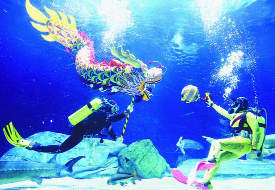 1月5日,北京海洋館兩名潛水員在中華鱘展區(qū)水中表演龍舞。