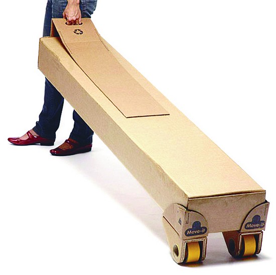 小拖車的材料是廢棄的紙箱,利用紙箱硬紙板進行簡單的組合,再將兩個輪子放在箱子的兩旁即可完成一個拖車,能運送20多公斤的貨物。