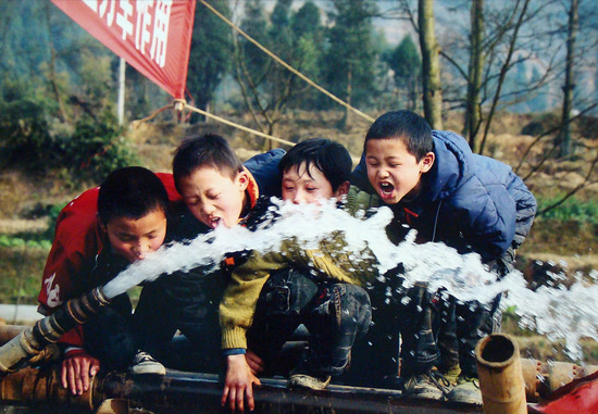 國家地質隊長年奮戰在干旱地區。圖為旱區小學生喜迎水井出水。