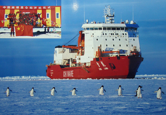 開展極地考察,持續深海資源勘查。圖為“雪龍號”極地科考船和昆侖考察站。