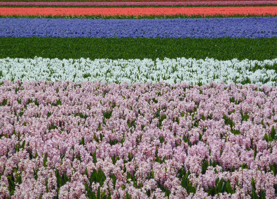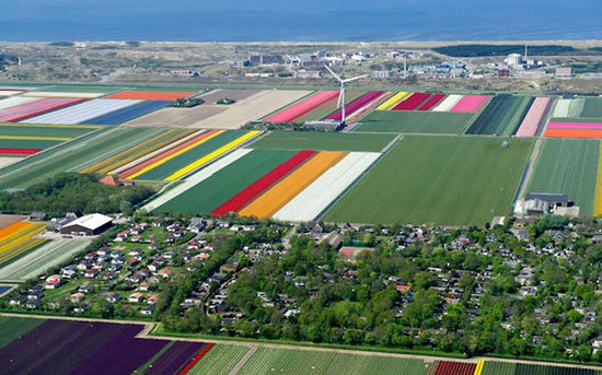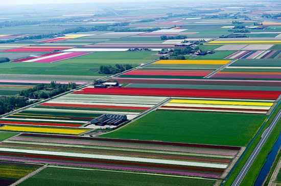 在彎彎曲曲的自行車專用道上緩慢騎行,靜靜的郁金香花田就在眼前,偶爾吹來(lái)一陣春風(fēng),滾起一道道縱橫幾十里色彩鮮艷的花之彩浪,把淡淡醉人的郁金香芬芳送入鼻息,沁人心脾。從阿姆斯特丹史基浦機(jī)場(chǎng)起降時(shí),透過(guò)舷窗觀望,一望無(wú)際的各色郁金香花田,仿佛給大地披上了一片片五顏六色的地毯,在蔚藍(lán)的蒼穹下,呈獻(xiàn)一幅遼闊壯麗、耀眼斑斕的自然之美。五彩的花田,繽紛綻放,荷蘭的春天就是這般美麗。