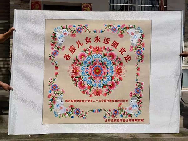 陳云珍為中國共產黨第二十次全國代表大會特別創作的羌繡作品《各族兒女永遠跟黨走》