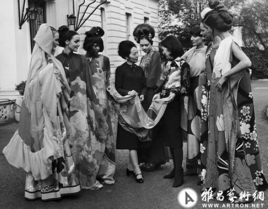 圖為森英惠(右四)向日本駐倫敦大使館的大使夫人(左四)展示自己的服裝 攝于 1972 年。