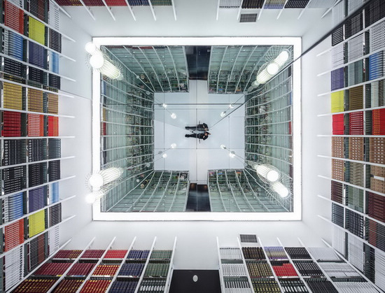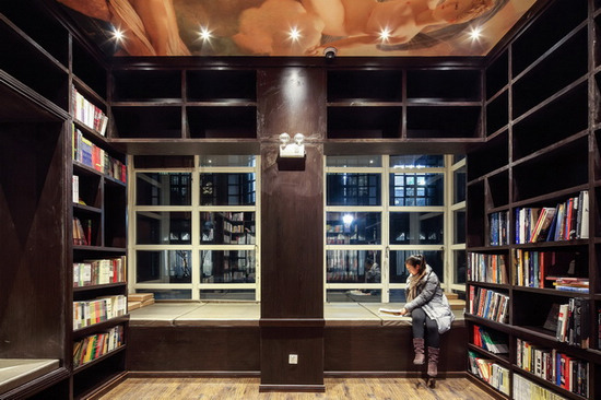二層的空間是呈“回”字形分布,外圍的走道上也隨意安置著座椅,配合墻壁上的壁畫裝飾,以及書架上的精選書籍—包括來自法蘭克福書展的第一版珍本圖書,打造出一種文化沙龍的觸感。回字形的中心則是二層的設計主題“天堂閱讀”的體現之處,空間正中的立柱鑲嵌著鏡子,四周以白色透明隔板的弧形鋼架構筑成一個橢圓形空間,白色書架豎立的一面通體相連,一直五層相連,到最底層的地方彎下來,與地面連接。頭頂的燈光反映在樓頂的鏡子上,星光點點,仿佛位于天際云間,觸手可及,人則似乎是從漂浮在空中的書本中擷取一冊,是一種獨特的閱讀體驗。