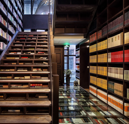 從透明玻璃地板下的書格到兩側如圖書館一般高高聳立的書架,滿滿當當的陳列讓人直觀感受到書海的氣勢。
