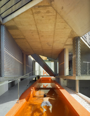 而整個 Pool house 的核心“pool”就位于這三個容器的中央位置,一道長長的橙色泳道在建筑物整體灰色與棕色的映照下顯得亮眼醒目,雖然與別墅中的游泳池或者公共游泳池相比單獨的一條泳道有些勢單力薄,但是對于普通家庭的娛樂和鍛煉來說已經足夠,平時有親友來訪時一同下水共樂一番也是綽綽有余。