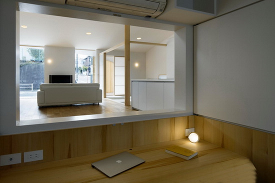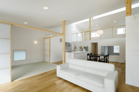 建筑內部的空間被打通,形成前后兩大塊。前方的公共空間包括廚房、餐廳和客廳,另外還有一小塊榻榻米區域。榻榻米是留給客人用的,與之搭配的是可以靈活拆裝的折疊式半透明屏風,客人留宿的時候就用屏風將這一區域“圈”起來。后方是一個兩層的私密空間,說是兩層,其實就是利用挑高搭了個閣樓出來,樓上是多功能區,樓下則是臥室和浴室,還利用下沉式空間藏了個小書房進去。此外,設計師還特地在墻壁上鑿出了許多大窗洞,有的甚至大到小朋友可以爬進爬出,如此一來,整個住宅就成了一個上上下下的游樂場,無論家人分散在哪些房間,彼此的聯系依然緊密。