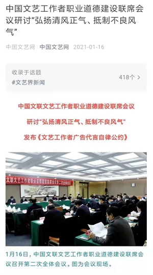 1月16日,中國文聯發布《文藝工作者廣告代言自律公約》(以下簡稱《自律公約》),引起文藝界積極反響和思考,引發社會各界廣泛關注和討論。