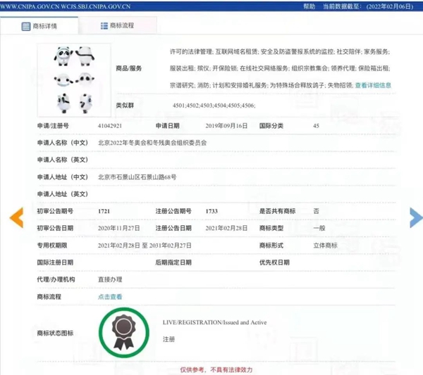 在北京2022年冬奧會和冬殘奧會吉祥物發布的前一天,北京冬奧組委就向商標局提交了中英文名稱“冰墩墩”“Bing Dwen Dwen”及其三維標志在全部45個類別的商標申請,并于2020年獲準注冊。