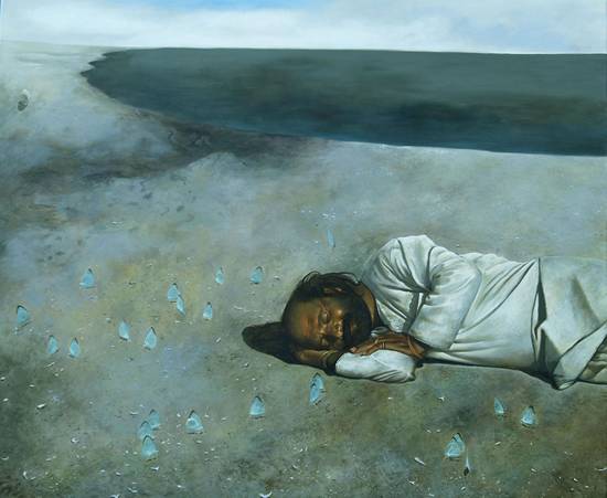 安賈莉阿圖?多迪亞的作品以把感性和理性同時交織在一起而聞名。她的作品《黎明黑牛奶》表現(xiàn)了黎明時分,人與自然之間的沉默交流。她通過畫筆制造畫面的線條肌理來表現(xiàn)“脆弱”的自然,其個性化的抽象符號具有超越現(xiàn)實(shí)的象征意義。