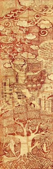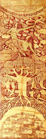 和拉朱一樣,N N里姆茲恩也意識到:繪制“魔力”符號能有效呈現(xiàn)富有挑戰(zhàn)性的理念。他作品的象征符號源自克拉拉邦草木青翠的鄉(xiāng)下——那里是他心中田園的根。在題為《樹下的房子》的作品里,緊密的空間呈現(xiàn)了農(nóng)舍家居的錯落有致。換個視角,田園牧歌般的寧靜有時也是暴風(fēng)雨降臨的前奏,作品中的“樹”似乎代表怪異極端的犬儒主義(一般認(rèn)為是蘇格拉底的弟子安提斯泰尼創(chuàng)立的古希臘學(xué)派)。在另一個以“樹”為造型核心的部分,沉默的箴言傳達(dá)悲憫的力量。他的藝術(shù)造詣在《封閉的泉》這件作品中可見一斑,對重壓之下“內(nèi)心”的分崩離析以及人類個體的弱小進(jìn)行赤裸裸地正面再現(xiàn)。